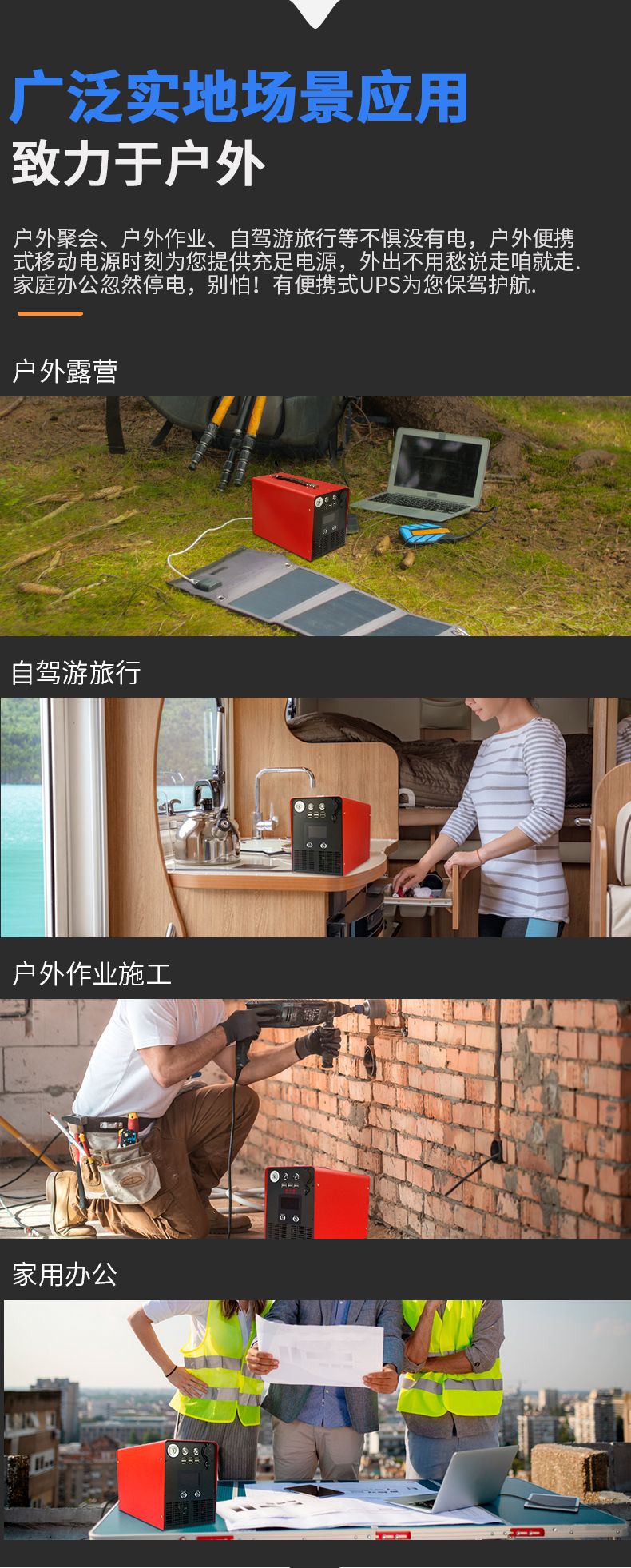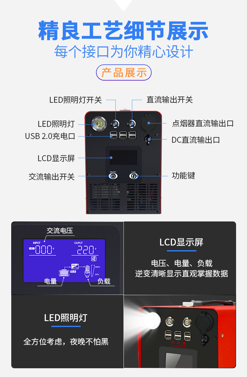 大功率純正弦波輸出,支持邊充邊放,支持太陽能、汽車充電,帶有ups功能、屏幕數(shù)顯,LED手電。適用于電腦、無人機、房車、車載冰箱、戶外露營,夜市擺攤等