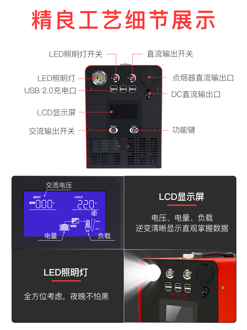 日月潭戶外電源220V筆記本電腦房車戶外擺攤露營停電備用應(yīng)急移動便攜大功率鋰電池,是移動電源與ups的結(jié)合體,實(shí)現(xiàn)邊充邊放功能,多U口輸出,帶LED手電及屏幕數(shù)顯