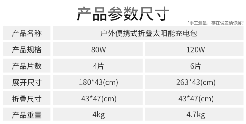 戶(hù)外折疊太陽(yáng)能光伏電池板80W大容量便攜移動(dòng)電源充電板,廠家直銷(xiāo),可折疊手提。多U口輸出,多功能。折疊尺寸為43*47(cm),展開(kāi)尺寸為180*43(cm)重4kg,適用于房車(chē),越野車(chē),野外宿營(yíng)等。