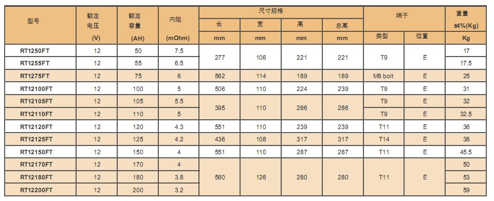 簡單介紹:前置端子鉛酸蓄電池RT-FT(6GFM-FT)系列產(chǎn)品參數(shù):標(biāo)稱電壓:12V;額定容量:55AH to 200AH;設(shè)計浮充壽命:8~15年(25°C)...